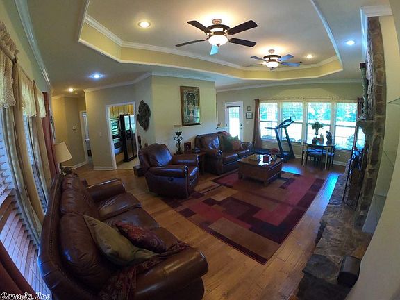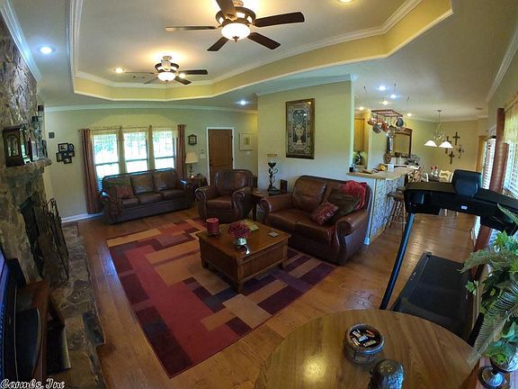 Custom home setting on a private 3.51 acre lot that is beautifully landscaped. The home is immaculate & the floorplan is very comfortable w/ 3 beds & 2 full baths. The home comes w/ a surveillance system, tons of insulation, 50-Gal Marathon hot water heater, a gorgeous propane fireplace with built-ins, tray ceilings, hardwood, saferoom, security gate, under ground utilities, & a RV pad w/ all the hook ups. The huge 30x40 insulated metal shop has lots of light, automatic door, roof vent, & all utilities.