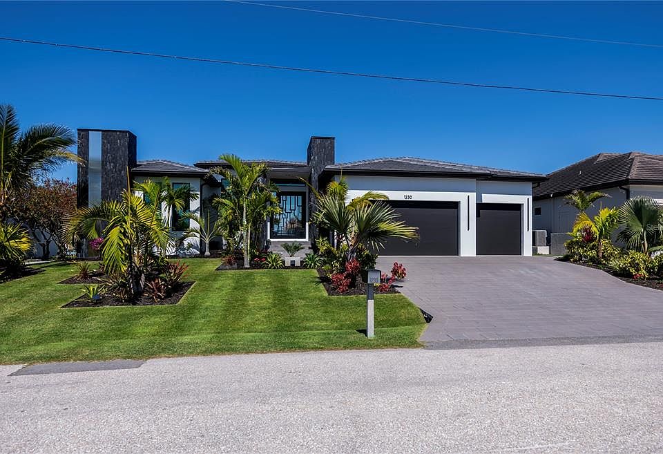 STUNNINGLY MODERN, PGI SALT-WATERFRONT HOME ON QUIET cul-de-sac FEATURING SAILBOAT ACCESS.This Custom 2024 3/3/3 home showcases European design and unique architectural features with GREAT VIEWS along with a superior HEATED POOL/SPA package! You are greeted by high end landscaping with a modern aesthetic & rare plants collected from @ the world. Rich stonework, stainless steel accents frame the contemporary entryway of a unique pivoting geometrical patterned mirrored front door. Stepping into the foyer you are greeted by a matching stone wall entry that is filled with abundant natural light and overlooks a spacious theater-like living room. It is an entertainer’s delight boasting plank tile flooring throughout and 10'zero corner sliding glass doors that open the home up inviting the outdoors in allowing you to enjoy the mesmerizing pool and waterfall sounds from the screened in lanai area that overlooks the wide waterfront.Culinary pleasures await, the kitchen is the centerpiece of the open floor plan, highlighting exotic Brazilian Quartzite waterfall countertops w natural stone backsplash all around.The lavish center island has an exquisite three dimensional drop ceiling above w geometric pendants. Cabinets are Italian made high gloss with a two tone design & soft close drawers/doors.Top-of-the-line built in stainless steel appliances throughout the kitchen with an induction cooktop finish off the clean contemporary look.The convenient pantry/prep area adjacent to the kitchen allows you to hide all counter top kitchen appliances from view. Lavish leisurely day or night as the panoramic water views are displayed from the formal dining area’s 10'slider, conveniently adjacent to the kitchen & complimented by a truly innovative chandelier. The master bedroom is spa-like w private pool/patio access. The Euro-feel master bath has high end textures/finishes plus a sensational mica accent wall. The master closet features built in laundry with full cabinetry, marble counters and a full size laundry sink. The wardrobe area of the closet is built out in full American walnut. Guests will have 2 choices of extraordinary bedrooms to choose from and their Euro-style bath is equally as impressive as the others w superior finishes and provides pool access. Upgrades include a bonus mudroom, survey, HyperFiber fiber optic internet,sprinkler system, kevlar shutters, impact windows, and a remarkable workshop in the oversized 3 car garage (connosueir collector alert). There is a generous high lift garage bay that allows for a lift! Enjoy the large covered lanai with built in outdoor kitchen while relaxing by the pool.SWIM YEAR ROUND as the SALTWATER POOL/SPA is heated& lounge at your leisure on the trendy sundeck. Ambiance lighting and water features are yours to enjoy with or without guests. The backyard boasts a 60 FT DOCK w angled 10k lift which allows you to keep a 30+ foot center console & 45' sailboat at the same time at your dock. Bring your fishing poles - quick sailboat access is here through Buckley Pass to Charlotte Harbor and the Gulf! Enjoy all the amenities that Punta Gorda offers, biking, fishing, dining& live entertainment, with award-winning beaches just a short ride away.With its prime location...don't miss the opportunity to experience the one-of-a-kind views and sensational lifestyle that await. This Punta Gorda Isles home offers the epitome of Florida living.SCHEDULE YOUR SHOWING TODAY and make this Florida waterfront dream home yours.