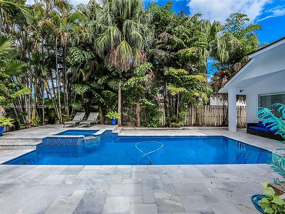 This beautifully crafted 3 bed, 2.5 bath home with pool and additional den/office sits on a quiet cul-de-sac just minutes from Hollywood Beach! Vaulted ceilings, marble floors, and expansive windows create a bright and airy atmosphere, while the open kitchen shines with quartz countertops and stainless steel appliances. The split floor plan offers privacy with a versatile den for office or guest use. The primary suite is a luxurious retreat with a sitting area, spa-like bath featuring a roman tub and walk-in shower, and custom closets. A fenced backyard with pool and patio is perfect for entertaining or unwinding. Freshly painted inside and out, complete with a new roof, two-car garage, and ample parking, this move-in ready residence combines comfort with timeless elegance.