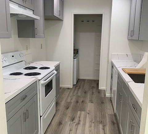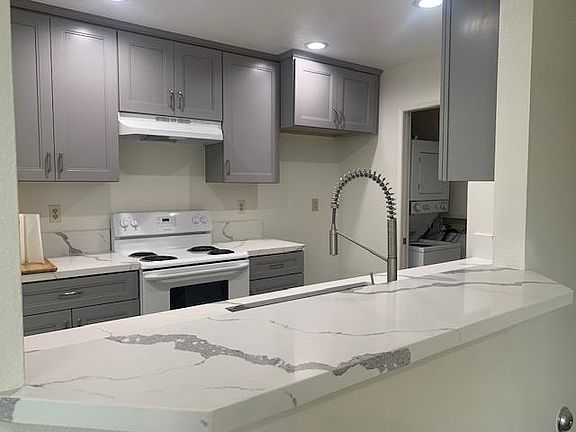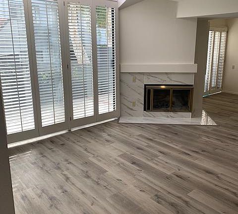 Beautiful Le Parc development, spacious 2 bedroom, 2.5 bath end-unit condo with nearly 1200 sq ft. Brand new kitchen cabinets & countertops. Freshly painted with new flooring throughout. Downstairs features living room, fireplace, kitchen, dining area, 1/2 bathroom and washer/dryer. Upstairs has 2 large bedrooms with vaulted ceilings each with their own bathroom. Detached two-car garage. Community Pool and Spa. Excellent location! Owner pays HOA, water, and trash. Renter responsible for electricity. No smoking and no pets. Tours will be available to qualified applicants. A qualified applicant has good credit, household income of $7,500 per month, and a clean background check. Applications accepted via Zillow.