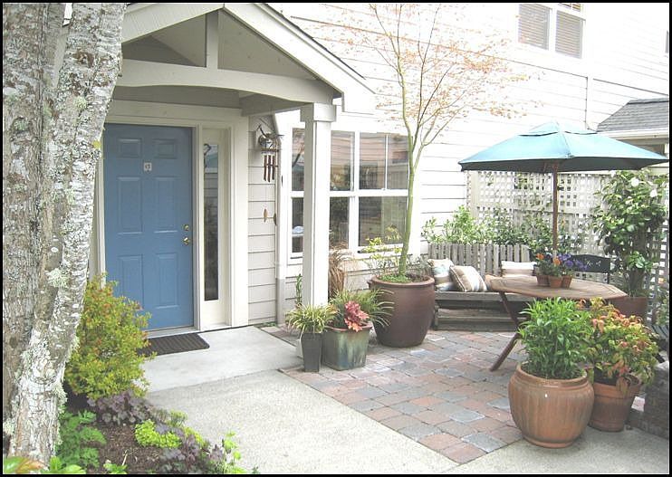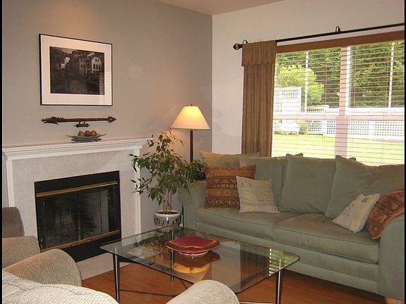 Chatham Cove condo for rent. Two story 1103 sf 2 bedroom, 2.5 bathrooms, detached 1 car garage and a reserved parking spot, front and back patios and lush shared back yard. Living, Dining, and Kitchen rooms tastefully updated, solid counter tops, stainless appliances, bamboo and tile floors, wood stove insert on main level. Upstairs are the carpeted bedrooms, laundry room with appliances, and 2 bathrooms. The master with its own walk-in closet, bath. Convenient to downtown Winslow and the ferry.