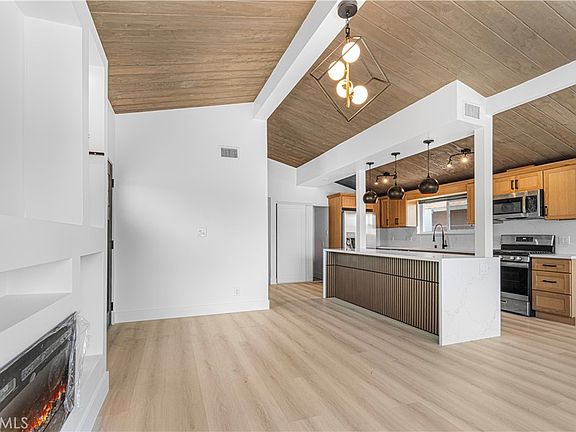 Step inside and be greeted by soaring vaulted wood plank ceilings, crisp white walls, and wide-plank light oak flooring that sets a warm, inviting tone throughout. At the heart of the home is a gorgeously reimagined kitchen featuring rich natural wood cabinetry, sleek black hardware, waterfall-edge quartz countertops, and a dramatic slatted island that anchors the space. Matte black pendant lighting and brand-new stainless steel appliances complete the modern aesthetic.