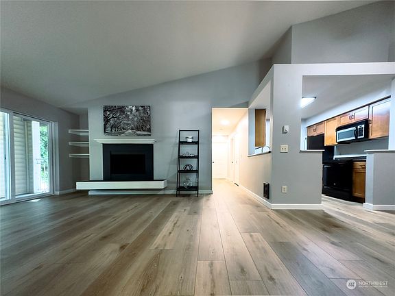 Rare top floor w/20ft vaulted ceilings, yet only 16 step to front door. Corner unit w/windows facing east to view your 2 pair parking & south facing patio w/natural light thru treelined walking paths along entire blvd. Fulfill your pantry organizing dreams w/3x5' hidden pantry + large open dining space to seat a crowd. The largest bedroom at the end of hall has ensuite bath + huge closet. For even more secure storage look on balcony. Then relax at home knowing the new LVP floors are sound rated IIC 73/STC 68 & waterproof. You may ditch your gym once you check out all the amenities available: fitness center, 3 pools, sauna, basketball court & lounge area. 5mins to Boeing, golf, grocery, restaurants, schools + more all within 1mile blvd loop.