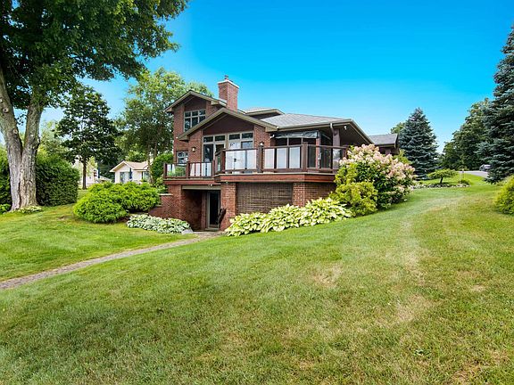 TORCH LAKE CRAFTSMAN STYLED HOME! A stone walkway leads you to the custom front door of your new waterfront brick home, with Frank Lloyd Wright inspired stain glass accents. Enter the foyer and take in the substantial design details considered when building this masterpiece. The living room features a custom brick fireplace, beamed ceilings, panoramic views of your Torch Lake paradise, sliding door walls leading to the deck, and gorgeous Maple hardwood floors. The cook in your family will delight in the kitchen with cherry cabinetry, granite counter tops, professional stainless appliances, large pantry with built-ins and more. Grab your favorite book or sit down for a game night on the screened in porch and listen to the waves lap the shoreline. Wake up to the sun rising over the lake in the primary suite enhanced by a large private bathroom with jetted soaking tub, separate shower; granite vanity; walk-in closet. You will appreciate the convenient main floor laundry room with plenty of cabinetry and built in desk area. Upstairs you will discover two additional bedrooms with a shared bath. The walkout lower level features a family room with a gorgeous stone fireplace, custom built-ins, slider to a patio; temperature-controlled wine cellar; mechanical room/workshop and best of all a Finnish sauna perfect after a day spent on the water. Your guests will appreciate the 2-bedroom guest quarters complete with living room, kitchenette and private bath. Outdoor entertaining opportunities abound with a large deck overlooking the lake and the glass paneled railing allows for unobstructed views. Professionally landscaped grounds with beautiful mature plantings and irrigation system. 2 car attached garage plus an additional detached heated garage with space for up to 4 cars, workshop area, and plenty of additional storage space. Experience lake living with family and friends and explore the miles of shoreline of the Chain-of-Lakes.