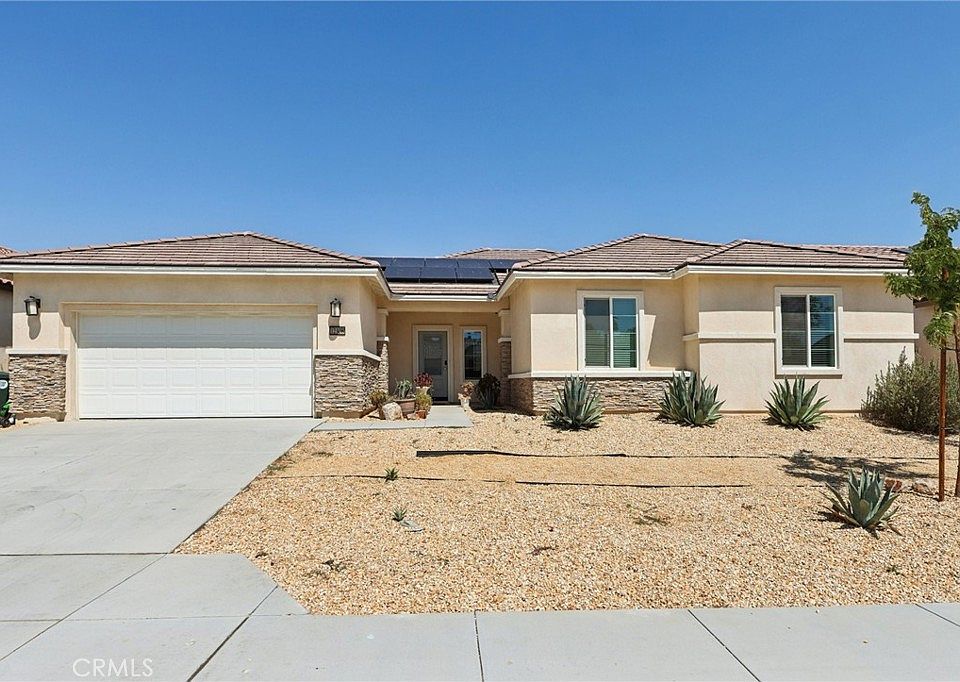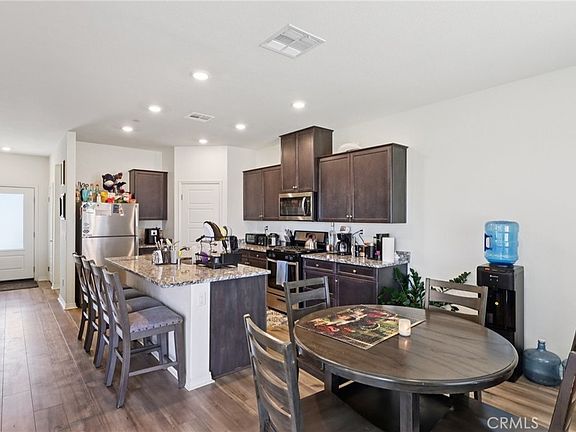 OWNED solar system and a modern single-story design! This newer home combines energy efficiency with stylish upgrades, including LVP flooring, stainless steel appliances, granite counters in kitchen and baths, and rich mocha-stained cabinetry. The open layout seamlessly connects the living, kitchen, and dining areas, creating the perfect space for everyday living and entertaining. The large kitchen boasts a center island with bar seating, pantry, and abundant cabinetry. A BONUS ROOM/office or optional 5th bedroom provides flexibility for work or guests. The primary suite is privately situated, featuring a walk-in closet and en suite bathroom with granite countertops. Additional highlights include well-sized bedrooms, a direct-access 2-car garage, and a spacious backyard ready for your personal touch. The hardscaped front yard with drought-tolerant plants adds curb appeal while keeping maintenance low. Conveniently located near schools, shopping, dining, and Sunset Ridge Park with easy access to Hwy 395 and the 15 freeway, this home is move-in ready.
