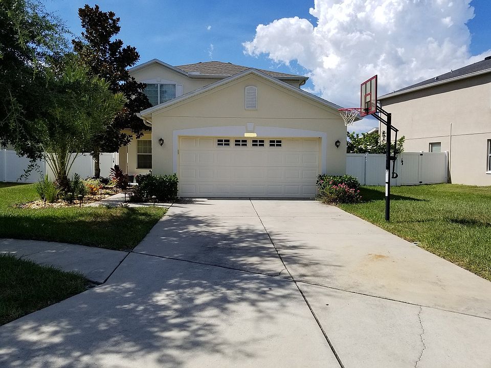 Beautiful 4 bedroom 2.5 bath energy efficient home on conservation lot in quiet cul-de-sac. The property features 2 car garage fenced in yard screen lanai with manicured landscape and butterfly garden. Hardwood laminate flooring and ceramic tile throughout the first floor carpet upstairs. There are three bedrooms upstairs which share a bathroom as well as a media room/loft. The master bedroom and masterbath are located on the first floor for extra privacy. The kitchen has upgraded stainless steel appliances granite countertops and island. Separate laundry room with energy efficient washer dryer and additional storage. The home also includes a water filtration system and a water softener. Lawn care included. Lawn care included with monthly rent. No pets.