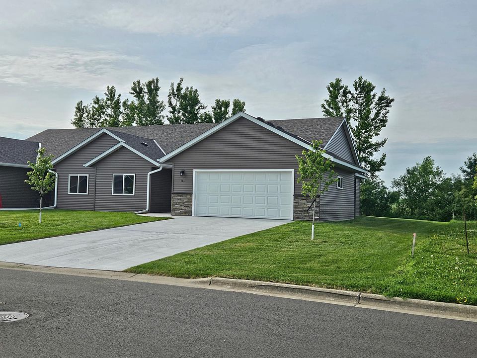 New construction one level townhome ready for you to call home. This 2 bed 2 bath home sits on the edge of town with the backyard bordering a field. Enjoy the very open floor plan, full guest bath, ¾ primary bath, walk in closet, kitchen island, hard surface countertops and plenty of cupboards. There is also a separate area for a dining table as well. Nice sized mudroom off of the 2-stall garage. No association fee!