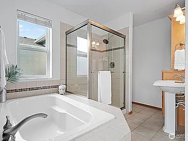 * Luxurious primary suite with sweeping views of the Seattle skyline, a double-sided fireplace, soaking tub, glass-enclosed shower, and walk-in closet