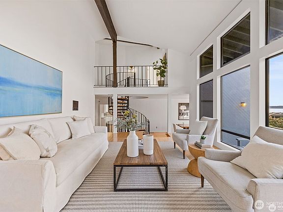 Expansive decks and wide windows draw in water and sunset views, while resort-style amenities elevate everyday living. Fresh interior and exterior paint highlight hardwoods and a bright open kitchen/dining. The showstopper is the big pool house—a year-round retreat with an indoor lap pool, dry sauna, hot tub, and lounge opening to the patio. The top floor hosts the primary suite plus a bedroom/office; the primary adds a view sitting area, dressing room, and walk-in closet. Brand-new carpet provides a crisp finish. Separate ADU with living room and bedroom (buyer to verify) offers great flexibility. Pneumatic elevator for easy movement. Large sunset decks. Minutes to Carkeek Park, Greenwood dining, coffee, everyday essentials, and transit.
