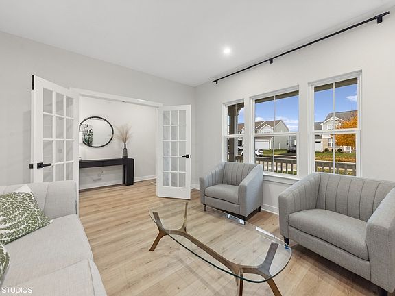 Welcome to this exceptional, two-year-old home that has so many upgrades it doesn't feel like your typical new construction. With high-end finishes throughout, this property feels like a designer's showcase. The main level impresses with wide plank light oak luxury vinyl flooring, a custom staircase, added recessed lighting, and custom lighting and fixtures- all meticulously selected to enhance the home's appeal. As you approach, a spacious, inviting front porch welcomes you. Just inside, off the foyer, is a versatile first-floor den with french doors. Further in, an expansive open-concept living space seamlessly connects the living room, kitchen, and dining areas, all bathed in natural light. The cozy living room features a gas fireplace and space for a built-in TV, perfect for movie nights. The gourmet kitchen is truly a showpiece, boasting a stylish backsplash, chic pendant lighting, sleek quartz countertops, and upgraded stainless steel GE appliances including a GE smart 4-door french door refrigerator. A large walk-in pantry adds convenience, while the oversized center island offers casual seating, or you can have dinner in the dining area and look out the large picture windows. Fresh paint graces every room, enhancing the home's elegance. An adaptable office space with luxury vinyl flooring can function as a home office, cozy den, or sixth bedroom. A beautifully designed half bath off the mudroom completes the main level. Upstairs, you'll find five generously sized bedrooms, including a luxurious primary suite with dual walk-in closets and custom blackout shades. The spa-like en-suite master bath includes a sleek double vanity with double bowl sinks, deep linen closet, and a glass-enclosed double shower with bench. The additional bedrooms offer ample closet space and custom roller shades, including a charming nursery with wainscoting, crown molding, blackout shades, and designer wallpaper. A second upstairs bathroom with a double vanity serves the additional bedrooms. The full basement offers so much potential with room for storage or the opportunity to easily finish it off into another living space. Plumbing already roughed in for a future bathroom. Outside, the oversized backyard with a spacious covered trex deck with electrical setup provides a private retreat. Custom Hunter Douglas cordless roller shades throughout the entire home. Practical amenities include dual-zone HVAC, 200-amp electrical, and an attached three-car garage. Located in a fantastic area with easy access to I-88 and Metra, this home combines stunning design with thoughtful functionality and convenience.