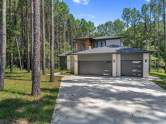 Modern Luxury Home on 1 Acre in Four Corners Subdivision. Nestled on a beautiful 1-acre wooded lot in the desirable Four Corners Subdivision, this custom-built 2,335 sq. ft. home combines modern design with natural surroundings. The exterior features a striking mix of stone, wood, and sleek black finishes that create an inviting contemporary look. Inside, you'll find a spacious open floor plan with 1,576 sq. ft. on the main level and an additional 700 sq. ft. upstairs, offering plenty of room for comfortable living. The home includes a large garage (over 700 sq. ft.) and welcoming outdoor spaces, including a front porch and back patio ideal for entertaining. Highlights include: 3 bedrooms / 2.5 baths, Water well with sprinkler system for easy lawn maintenance, A tranquil creek running through the backyard, Soaring ceilings, expansive windows, and modern finishes throughout, Peaceful wooded setting with both privacy and convenience Located just minutes from Livingston.