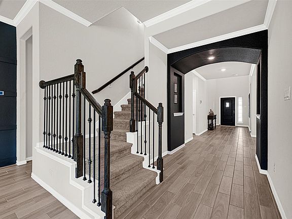 Picture yourself in this beautiful 4-bedroom, 3.5-bath home with a Second Bedroom downstairs in the highly sought-after community of The Groves. The open-concept island kitchen includes granite countertops, a breakfast bar, 36" designer cabinets, and stainless steel appliances. The primary suite boasts a spacious walk-in closet, dual sinks, granite countertops, and a separate shower and soaking tub. Upstairs, you’ll find a large gameroom and two additional bedrooms, providing plenty of space for family or guests. Other highlights include wood-look tile flooring in main areas, crown molding, brushed nickel light fixtures, 2" blinds, sprinkler system, and a covered patio—perfect for outdoor enjoyment. Energy-efficient features include a 16 SEER HVAC system, programmable thermostat, and radiant barrier roof decking. This is a Wi-Fi CERTIFIED™ smart home, combining comfort, efficiency, and modern convenience.