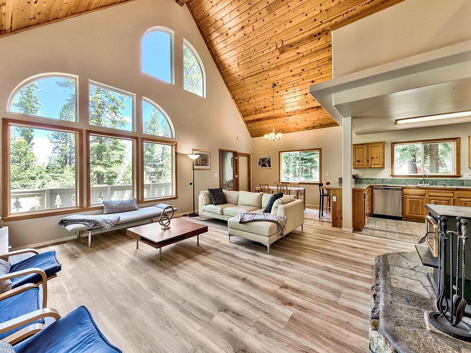 This gorgeous home has undergone a transformation and is turn-key! New flooring, interior paint and stainless-steel appliances. High up in the Pine Trees, this home is nestled on a little over 1/3 acre sitting back from the street with treetop views. High vaulted ceilings with picture windows to catch the daytime and sunset views. Open floor plan with an expansive living/dining area. 3 bed/2bath with a loft that can be used as an office. Close to downtown Truckee. Quick access to Prosser Lake.