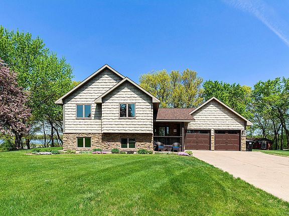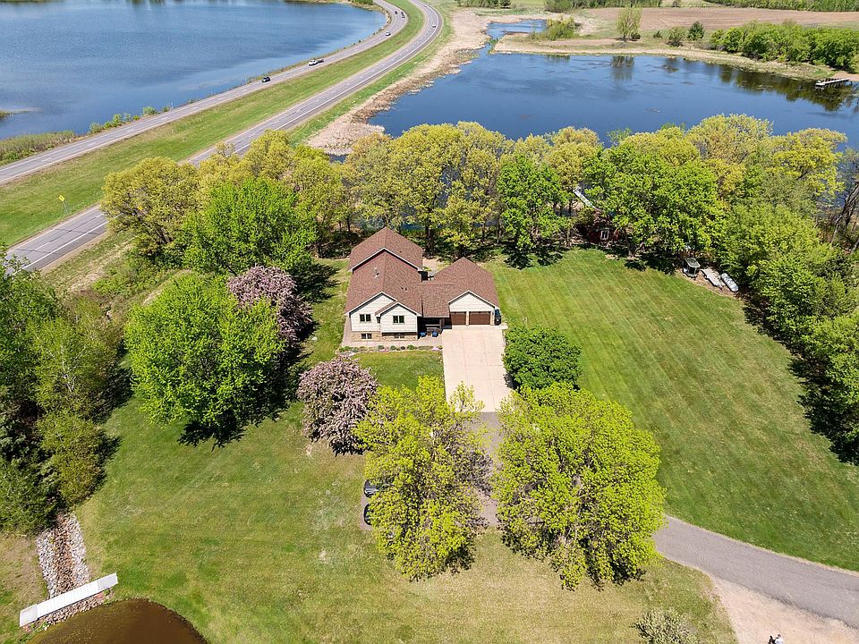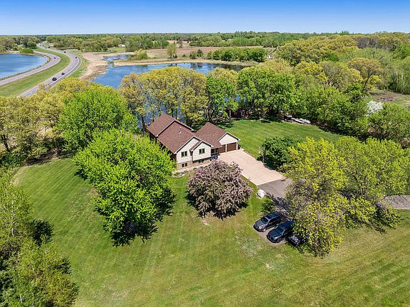 Set on over six breathtaking acres with tranquil water views and a shimmering pond, this impeccably maintained & fully custom home is a rare find that integrates elegant upgrades with comfort and the beauty of nature. From the moment you arrive, the recently painted exterior and new roof exude curb appeal, complemented by professional landscaping featuring perennial gardens, retaining walls, stone stairs leading to the water, and a cozy fire pit. Step inside to discover a chef’s dream kitchen with stunning granite countertops, custom-built cabinets, updated stainless steel appliances, and a wine refrigerator situated perfectly into a bar-height island. The home’s updated flooring flows seamlessly through spacious living areas, including a large lower-level family room (pool table included if you want it!) and dining room, both with comforting gas fireplaces. Remodeled bathrooms and a primary suite with an attached office or sitting area (complete with its own private deck!) elevate the everyday. You’ll find a third and double-sided fireplace up here also. Anderson windows (some triple-pane for superior sound abatement) frame stunning pond views from both sides of the home. Outside, freshly stained decks and an exposed aggregate patio invite relaxation, while a fully finished recreation building with heat, A/C, power, and its own patio offers endless possibilities. A heated and insulated garage, new water pressure tank, water heater, water softener, and newer washer and dryer ensure modern convenience. For outdoor enthusiasts, a basketball hoop, easy access to Highway 169, and a dock await, where you can fish for crappies, sunfish, bass, and northern pike. Daily wildlife sightings—swans, geese, eagles, turkeys, deer, foxes, ducks, and rabbits—add to the enchantment. With every detail meticulously upgraded, this is more than a home; it’s a lifestyle where luxury meets tranquility.