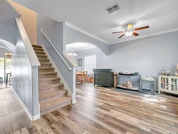 Experience the Florida Lifestyle at Its Finest Set in a quiet location with conservation views and no backyard neighbors, this home offers both privacy and comfort. A 6' PVC fence surrounds the yard, creating your own private retreat. Even better, the current MORTGAGE IS ASSUMABLE — a rare advantage in today’s market. Inside, you’ll find a warm and inviting layout with thoughtful upgrades. The kitchen features 42" espresso-stained cabinets with crown molding, granite countertops, and stainless steel appliances. A large center island with pendant lighting makes it a functional hub for cooking, dining, and gathering. The family room flows naturally from the kitchen, offering plenty of space for relaxing or entertaining. Distressed-look wood laminate plank flooring runs through the main living areas, while crown molding accents key rooms, adding a touch of detail. Upstairs, the primary suite offers a soaking tub, walk-in shower, dual granite vanities, and a walk-in closet. Secondary bedrooms each have their own personality — including one with French doors for flexible use and another with a wood plank accent wall. A full bath and an upstairs laundry room add to everyday convenience. The backyard is spacious and versatile, with room to design your ideal outdoor space or even add a pool. Community Amenities This neighborhood offers resort-style living with a lap pool, beach-entry pool, splash pad, playground, fitness center, clubhouse, dog park, and tennis and basketball courts. This home combines function, comfort, and the rare benefit of an assumable mortgage — a smart choice for buyers looking to enjoy the Florida lifestyle.