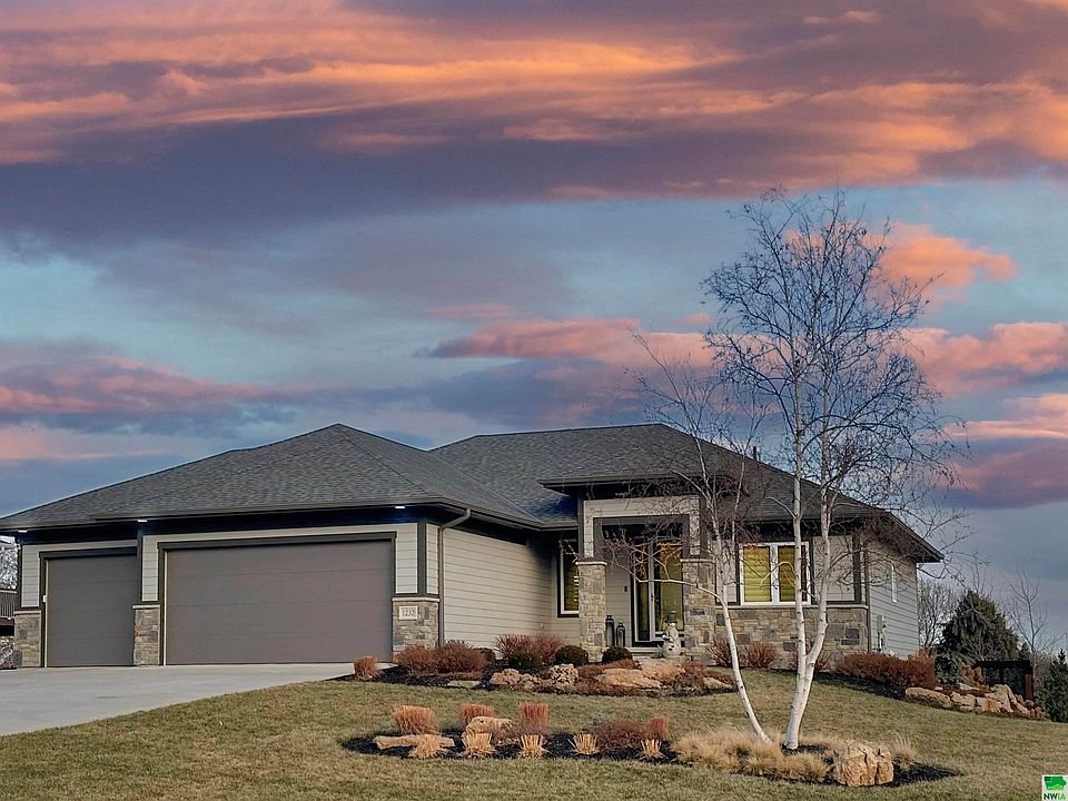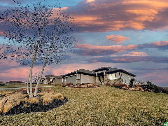 This stunning ranch home is located in the Blackhawk Ridge development in Hinton, IA. Situated on a friendly cul-de-sac, this home boasts 4BRs, 3BAs & countless upgrades throughout. You will be captivated by the tasteful living room w/ electric fireplace & large windows overlooking your new backyard oasis! Tile flooring & custom blinds throughout. Main level laundry. Spacious kitchen offers pantry equipped w/outlets to keep the counter free of appliances, quartz counters along with vast island equipped w/ outlets for all your potlucks and gatherings! Dining boasts large windows and walkout to upgraded covered balcony with glass railing and poured concrete that offers tranquil retreat to enjoy picturesque views of the landscaped backyard and pool. Luxurious master's suite is a true haven, featuring a walk-in closet & tiled walk-in shower. Dual sinks & quartz counter add a touch of spa-like indulgence. Additional 2 BRs on main include generously sized closets for plenty of storage. The lower level of home features another BR, along with a full bath. Lower level boasts a spacious family room equipped w/ wet bar and walk out to pool area. You will also appreciate the recreation room with rock climbing wall and padded flooring! This home is a showstopper, w/ amenities that WOW! Professional landscape designed with outdoor lighting and music system surrounding the 20x40 salt water pool. Salt pool offers electric heater, electric cover, diving board and water slide. New custom pergola is pre wired for a hot tub. You’ll enjoy the custom outdoor kitchen equipped with granite counter tops, EVO griddle grill, stainless steel appliances and cabinet inserts and TV mount. After a day of swimming, relax by the 36’ Breeo Smokeless fire pit.The exterior offers upgrades including; permanent holiday lighting, sprinkler system for lawn and drip system for landscaping w/ rain sensors. With the impressive exterior and interior and exceptional features this property is certain to impress!