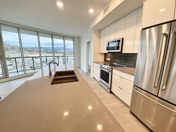 Located in the highly desirable modern development Ellis Parc, this 2 bed + den, 2.5 bath condo features 1100 sq. ft of open concept living space, this 11th floor valley-view condo features quartz countertops, stainless steel appliances, modern finishings, large wrap-around deck and lots of windows with ample natural light. This unit faces North towards Knox Mountain with stunning valley views and peekaboo lake view. Gym located in Ellis Parc available to residents!