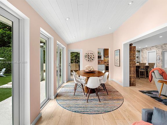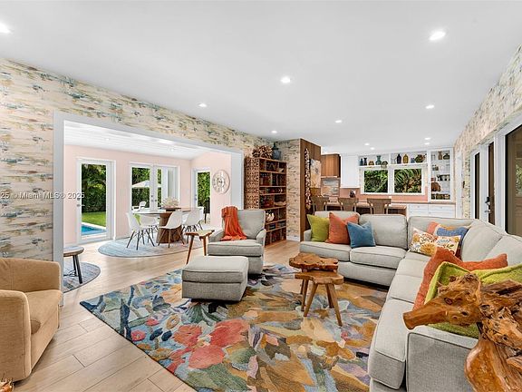 Exquisite 3BR/3BA + office one-story residence in Coral Gables with 2,872 total SF on a 9,375 SF lot. Surrounded by lush landscaping, the home offers a heated saltwater pool with lighting, coral stone patio, pergola for alfresco dining, ivy-clad walls, and an outdoor shower. Interiors blend elegance and comfort with all-new floors, impact French doors/windows including smart glass technology, fluted paneling, and custom finishes. The open kitchen features bespoke cabinetry, granite counters, and luxury appliances. The principal suite boasts dual walk-ins and spa-like bath with soaking tub, glass shower, and dual vanities. Additional highlights: all new bathrooms, upgraded climate control systems, refined laundry room, and 1-car garage with storm-grade doors.