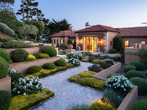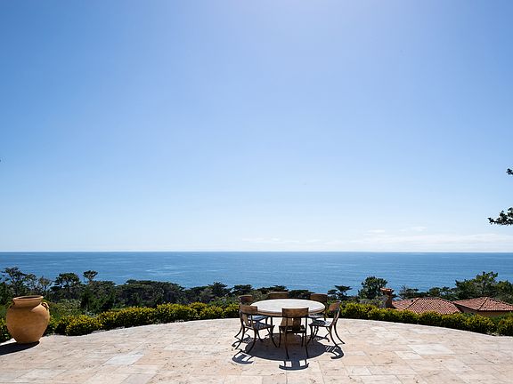 Introducing Villa Okeanos with the best ocean views above prestigious 17 Mile Drive; a rare and extraordinary work of art that embodies the authentic spirit of a Mediterranean Villa. Sited on 2 acres, this estate is rich in ultimate privacy and serenity. Possessing spectacular and sweeping 200 degree views of the Pacific Ocean, there are 3,000 sq.ft. of limestone terraces for enjoying sunsets. European gardens complement the terraces, courtyard and outdoor kitchen with pizza oven. All on one level, the main house and guest house total nearly 8,000 sq.ft. with 7 bedrooms, 6 are ensuite, 2 are primary suites, a chefs kitchen, 2 laundry rooms, formal and informal dining, living and family rooms. Stunning masterwork is illustrated throughout, from gold leafed hand painted domes by Shelly Cost, antique ceiling, hand carved Chambertin French Limestone by Christopher de Rose to award winning designer Roger Harned, world-class artists worked side by side to create this opus.
