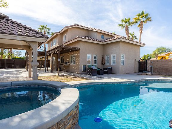 Welcome to your dream home in the beautiful Rancho Frontera community of Calexico, California. From the moment you arrive at this stunning corner lot, you'll be captivated by its charm and elegance. The home's striking architecture, vaulted ceilings, and plantation shutters throughout create a sense of sophistication while maintaining warmth and comfort. As you step inside, you'll find an open and inviting layout designed to bring people together. The downstairs is a thoughtful blend of spaces, including a welcoming living room, a formal dining room, and a cozy TV room, all seamlessly connected to the kitchen. The kitchen, truly the heart of the home, is perfect for both quiet family dinners and lively gatherings. With one bedroom and a full bath on the main floor, there's room for guests or extended family to stay comfortably. Upstairs, the home continues to impress. A versatile office or studio space provides a peaceful spot for work or creativity, while the three additional bedrooms, including the master suite, offer privacy and comfort. The master suite is a true retreat, featuring a soaking tub, dual sinks, and a spacious walk-in closet that makes organizing a breeze. The backyard is nothing short of spectacular. Imagine summer days spent enjoying the newly added 8-foot-deep swimming pool, complete with a cascading jacuzzi spa. Whether you're hosting a barbecue under the gazebo, relaxing in the serene sitting area, or shooting hoops on the basketball court, this outdoor space was designed for making memories. This home isn't just a place to live it's a lifestyle. Located in a sought-after community with a generous lot size and an inviting atmosphere, it's everything you've been searching for. Set up your showing today, and let this exceptional property welcome you home.
