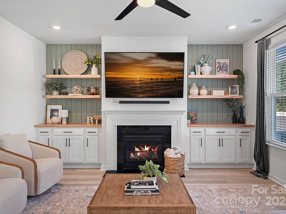 On the main level, the living room showcases custom built-ins with warm ambrosia maple floating shelves and coordinating countertops, adding both function and character. The breakfast area features a second set of built-ins with a matching maple counter and drawer microwave - a detail that elevates design while adding everyday convenience. At the heart of the home, the chef’s kitchen is equipped with upgraded countertops, custom finishes, and premium details, creating a space as enjoyable to cook in as it is to gather with friends and family. Statement accent walls and upgraded lighting bring personality and warmth, while refined hardware ties each space together. The powder bath has been completely refinished with an updated, polished look that guests are sure to notice.