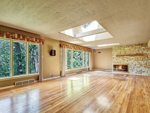 Harmonious park-like setting and wooded views from every window await you in this one-of-a-kind brick hillside ranch with walk-out basement, gracefully built into a rolling hillside lot in the heart of Palos Park. Inside, find an efficiently designed, open interior. The welcoming foyer seamlessly flows into a large and bright living room with a real stone fireplace, hardwood flooring, skylights, and big picture windows overlooking the emulating wooden scenery. Adjacent find the spacious eat-in kitchen with lots of cabinets, stainless steel appliances, and a bright dining area with a large bay window. Three bedrooms and two bathrooms on the main level include a master bedroom with an ensuite bathroom. Secluded in the back discover a relaxing sunroom with a nostalgic beamed ceiling and oversized patio doors leading to an elevated wooden deck. Step down to the ground level/walk-out lower level with a notable family room, a wet bar, a second fireplace, a fourth bedroom, a third bathroom, a workshop, and storage area. The house also comes with a whole-house generator. A terrific location within walking distance to the train, the famous Plush Horse ice cream parlor, and the Forest Preserves. Brand new roof July 2024! Easy to see & to buy so schedule your easy viewing before this rare find is gone!