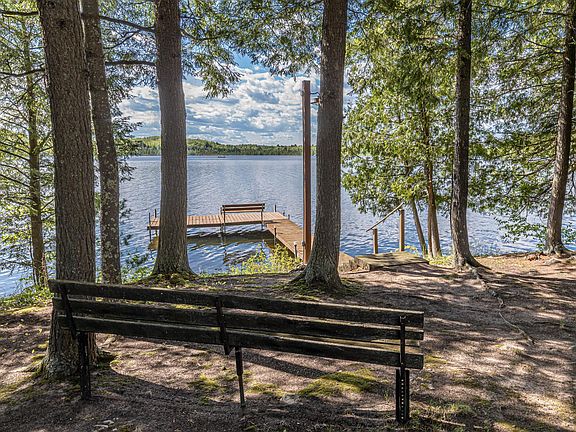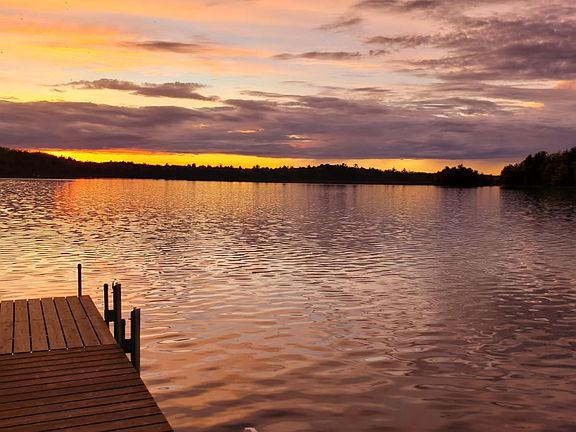 Meticulously maintained and move-in ready, this 3bed/2bath home offers 1615 sq ft of comfort and style with 105' of sand/stone level lake frontage on Squirrel Lake, Class A Musky Lake. The Cedar siding, recently stained and accented with stone wainscoting, pairs beautifully with low maintenance composite decking. A 3-car detached garage provide ample space for storage or hobbies. Cozy entry with pine walls and laminate flooring, Inside, the open-concept kitchen, dining, and living area boast wood cathedral ceilings, wall of windows and a patio door that frames stunning lake views. Gorgeous wood floors and stone wood-burning fireplace add warmth and charm. The kitchen features updated stainless steel appliances and Alder cabinets. Two main level bedrooms and bath with tiled walk-in shower. Finished lower includes spacious family room, a third bedroom with egress window and second full bath. Huge storage/laundry/utility/exercise room finishes the lower. Make this your getaway!