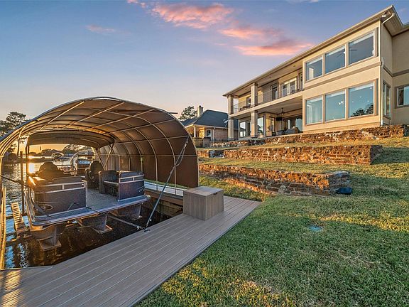 Immaculate five (5) bedroom four (4) bath Lakefront home in the highly sought after gated Longmire on Lake Conroe community. Recent HVAC systems & Generac Generator. Upon entry is a large open dining room which just beyond is the large family room with an impressive stone gas-log fireplace and a wall of windows affording great views of Lake Conroe and the NEW bulkhead/dock/boat lift & cover. Light and bright island kitchen features freshly/professionally painted white cabinets, gas cooktop, warming tray. Breakfast room presents amazing lake views. Chiseled travertine flooring and recent paint/carpet throughout. Master bedroom with access to covered back porch and elegant master bath with jetted garden tub. Guest suite down with full bath. Upstairs features include a large gameroom, 3 additional bedrooms and 2 full baths. Massive 30' wide balcony affording beautiful Lake views is accessible from the gameroom & two upstairs bedrooms. Garage features SafeRack storage/new flooring surface.
