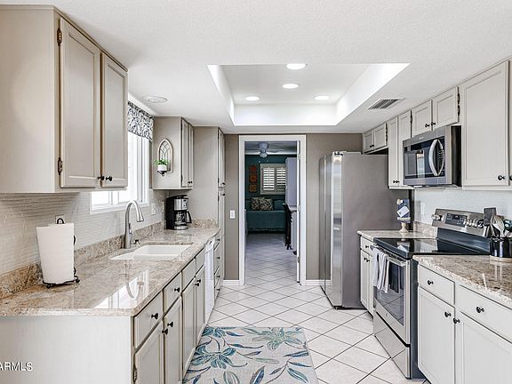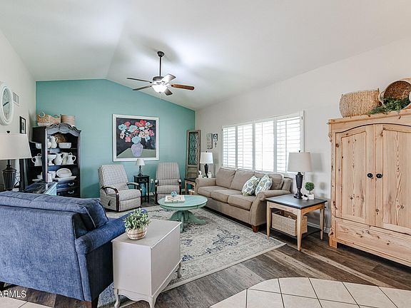 Step inside and enjoy the warm and welcoming atmosphere, of this 2 bedroom & 2 bath home with vaulted ceilings, tile flooring and ceiling fans throughout. The living room provides a cozy space for relaxing or entertaining. Kitchen updates include stainless steel appliances & granite countertops. Primary bedroom has an en suite bath with dual vanities and ample storage.