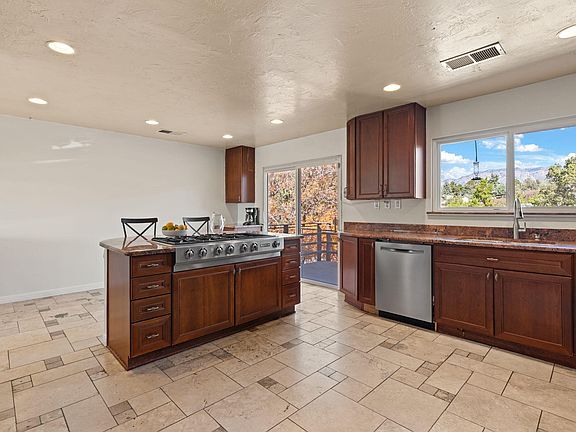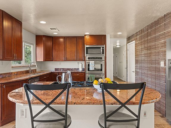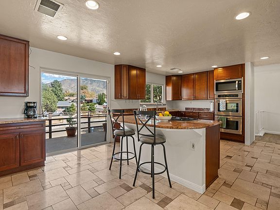 Spacious 2,770 sq ft split-level home in the Northeast Heights with 4 bedrooms, 3 baths, and beautiful Sandia Mountain views. The kitchen offers a 6-burner gas range, dual ovens, stainless appliances, granite counters, and cherry cabinetry. Two living areas and a large game room with 8 ft pool table provide space for work, entertainment, or relaxation. Fresh paint, travertine tile, and newer vinyl plank flooring--no carpet. Energy features include solar, dual-zone heating and cooling, and a 2020 roof. Corner lot with fenced yard, greenhouse, two elevated porches, and oversized garage with workshop. Near trails, schools, and shopping.