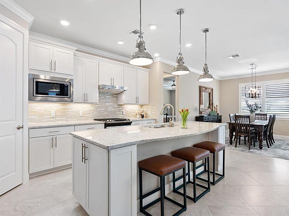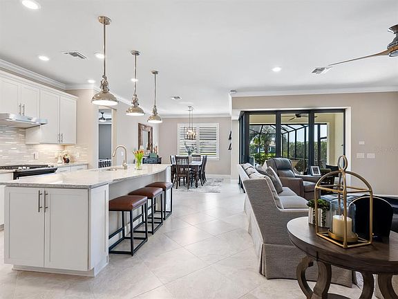 Stunning lakefront pool home with premium upgrades and unmatched views. Experience luxury Florida living in this exceptional lakefront home built in 2018, offering one of the most beautiful views in the community. This three-bedroom, two-bath residence with a den features an open layout, elegant crown molding, plantation shutters and a neutral palette throughout. The gourmet kitchen impresses with stainless steel appliances, a gas cooktop, under-cabinet lighting and a walk-in pantry enhanced by California Closets organization. Every room features custom California Closets for stylish, efficient storage. Go outside to your private oasis, an inviting saltwater pool overlooking the lake, with a covered lanai plumbed for an outdoor kitchen. Enjoy peace of mind with a Kevlar electronic hurricane screen and new (2025) accordion/rolldown hurricane shutters on all windows and doors. Additional highlights include overhead garage storage racks for optimum organization and a meticulously maintained, move-in ready interior. This home offers a combination of elegance, comfort and security, Florida living at its finest.