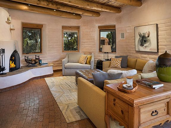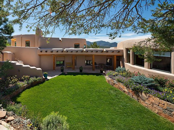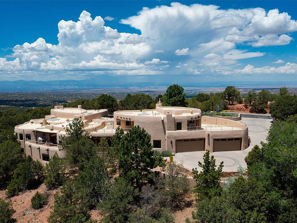 Welcome to 1233 North Summit Drive. One of the most extraordinary homes in all of Santa Fe, this captivating residence stuns with powerful architecture and majestic mountain views, and celebrates the ultimate Santa Fe lifestyle. Located within the coveted, private gates of the Santa Fe Summit, this 7,200 sq. ft. adobe residence is one of architect/builder Mike Fischer’s most exceptional works. Built with uncompromising craftsmanship, the home blends timeless Santa Fe style with thoughtful modern updates—showcasing curved plaster walls, viga and beam ceilings, handcrafted fireplaces, and luxury finishes throughout. The main level is designed for entertaining, with spacious living and dining areas, while the upper floor is devoted to a private primary suite, complete with a luxurious bath, sitting room or office, and a rooftop deck that captures sweeping mountain views. Thoughtful updates include a 2018 kitchen renovation and a 2020 spa-like bath remodel, bringing modern elegance to traditional adobe design. The lower level offers excellent guest accommodations, with two bedrooms, two baths, and a large media/game room. A rare 4-car garage adds convenience and storage, while recent upgrades impress, such as new Pella windows, a TPO roof, and newly designed hardscape and lush, vibrant, surrounding landscape.