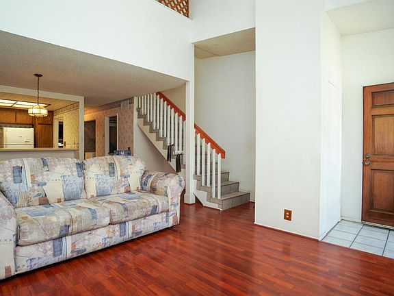 Lovely 1 bedroom, 1.5 bathroom townhome for sale in the charming community of Nantucket Village. Front entry leads to the open living and dining area featuring laminate wood flooring, vaulted ceiling and high windows with shutters providing great natural light. The traditional style kitchen with tile flooring includes a high breakfast bar counter with a wide open view to the living area. Stairway leads to the bedroom featuring linen storage, a walk-in closet and en-suite bathroom with shower. Additional features include indoor laundry, private enclosed front patio, attached two car garage and a community pool/spa area directly across from the home. Homeowners association includes home insurance, community maintenance, sewer, trash and water.