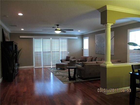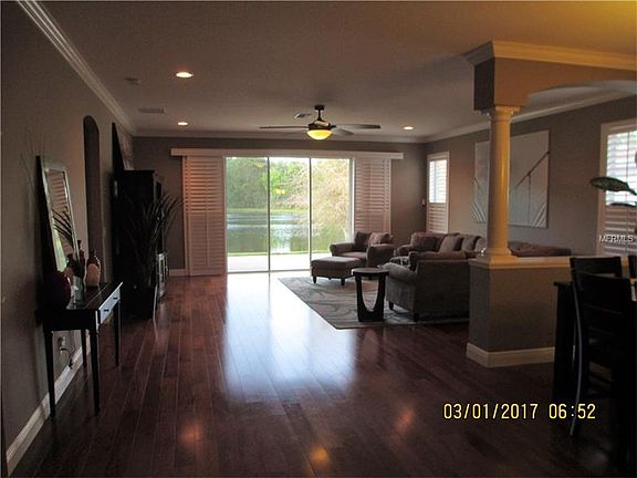 Beautiful home on premium lake/pond lot. Many fine features grace this home - Wide plank Brazilian Oak floors, wood cabinetry, tile in wet areas, custom window treatments, wide baseboards, crown molding and custom lighting throughout. The floor plan is open & bright. All the bedroom are downstairs. The master bedroom is at the rear of the home, where as the additional bedrooms are at the front of the home. The master suite has tray ceiling, large bathroom with huge shower and closet. The main living area has a wall and columns to separate it from the living room. The bonus room upstairs offers a fabulous built in bar with lighted cabinets. So many other feature include Stainless newer appliances, dual WIFI accessible A/C units, WIFI accessible alarm system, party sized patio and large 2.5 car garage with some built in shevling. This Home is located in IVY LAKE ESTATES, an impressive gated Pasco Community just off the Suncoast Pkwy and SR 54. Excellent school system. 20 Minutes to Airport. No CDD fees and low HOA fees.