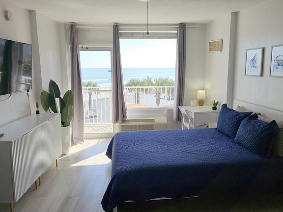Enjoy ocean views from this updated balcony studio on the third floor of Sea Dip Beach Resort. This fully furnished unit features a comfortable queen bed, a sofa futon, a flat screen TV, a work desk, and a bright open layout. The kitchenette includes a full size refrigerator, microwave, coffee maker, and dining table for two. The studio has a fresh coastal feel with light flooring and plenty of natural light. Step onto your private balcony and enjoy views of the pool and the Atlantic Ocean. The bathroom is clean and well maintained with white tile and modern fixtures. Sea Dip offers an oceanfront pool, indoor pool, beach access, laundry facilities, and parking. This building allows short term rentals including Airbnb which makes it ideal for both personal use and rental income.