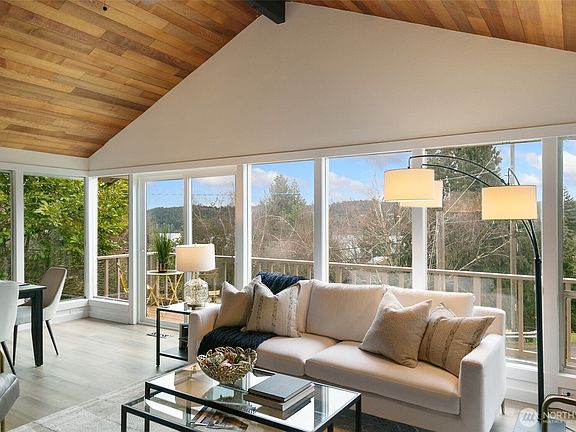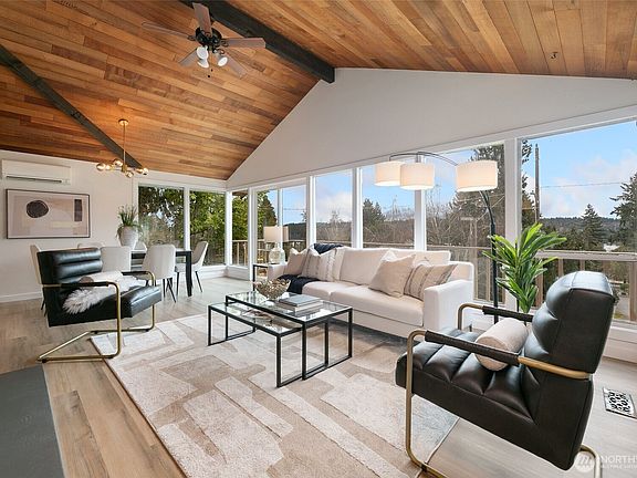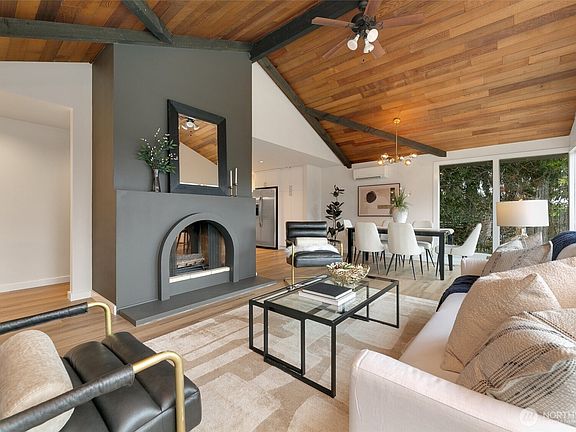 Situated at the top of a quiet, dead-end street, you’ll find this beautifully updated home w/ views of Lake Washington & the Cascades. Featuring eye-catching details throughout, including a sun-drenched living room w/ wood paneled vaulted ceilings, floor to ceiling windows & glass doors, & statement two-sided Venetian plaster fireplace. An open-concept, updated kitchen w/ skylight & dining room open to a lush tiered backyard & deck. Pass by the office, as you head down the hall to 3 bedrooms & 2 baths, including the primary w/ en-suite. Downstairs offers an add’l rec-room, kitchen, 2 more bedrooms & full bath. Two-car garage. Efficient mini-split AC. Blocks to the Burke Gilman Trail, close to parks, beaches, great schools, U-Village, & UW.