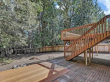 Split level houseLarge deck in backyardLarge roomSmall fire pit