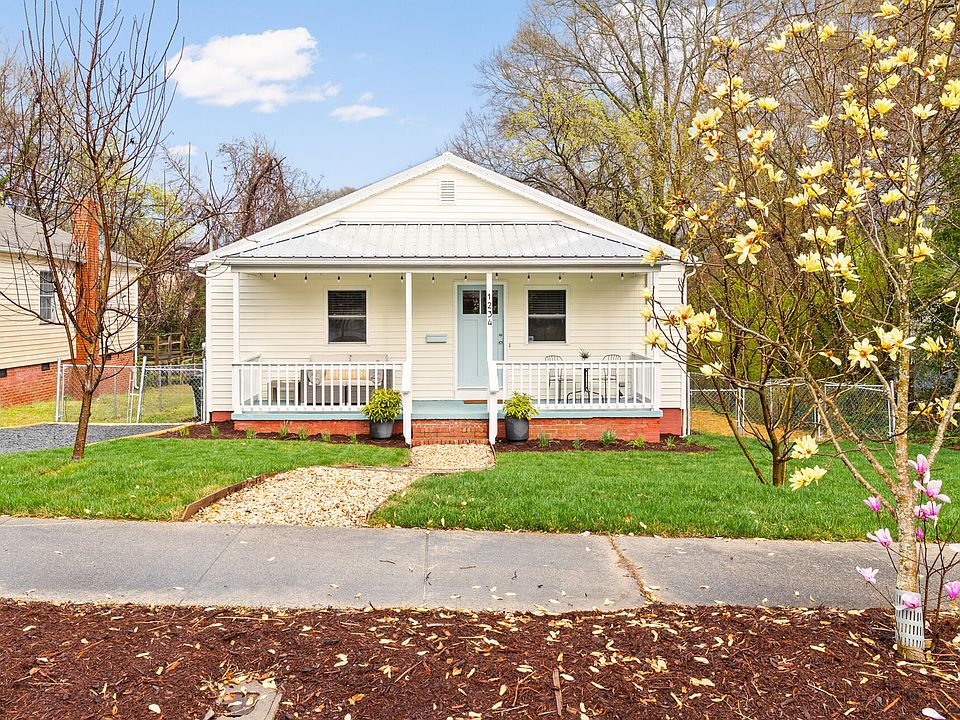 Offer in hand. Offer deadline - Monday @ 3:30pm. Nestled in Durham's historic Walltown neighborhood, this beautifully maintained 3-bedroom, 2-bath home offers convenient single-level living, blending classic character with modern upgrades. From the moment you arrive, you'll appreciate the quiet charm of Berkeley, a peaceful street that's not a cut-through. The home's curb appeal is immediately evident—from the sleek, long-lasting metal roof to the deep green of the freshly sodded yard, the freshly painted porch with a pop of color, and the stylish new wooden front door. It all welcomes you home. The expansive front porch is the perfect spot to enjoy your morning coffee or relax with a friend while watching the sunset. The landscaped yard features fruiting fig and apple trees, along with native magnolias, creating a serene and picturesque setting. Step inside to a bright and inviting interior, where a spacious living room and kitchen provide ample space for entertaining. Thoughtful updates include stylish new light fixtures throughout, contemporary bathroom vanities, and multiple solar tubes that bring natural light into the home's cozier spaces. The spacious primary suite, located at the back of the home for added privacy, features an en suite bathroom that offers a peaceful retreat. The flat backyard, complete with mulberry trees and a generous storage shed, backs up to Durham-owned green space, ensuring your private yard will remain undisturbed. Conveniently located just 0.4 miles from popular dining spots like Joe Van Gogh Coffee, The Loop, Sho Nuff Seafood, and Metro 8 Steakhouse, with Costco only a 4-minute drive away. Enjoy easy access to Downtown, 9th Street, and Duke University. With the inevitable revitalization of Northgate Mall, Walltown homes will see an increase in both desirability and property values. Don't miss this opportunity!