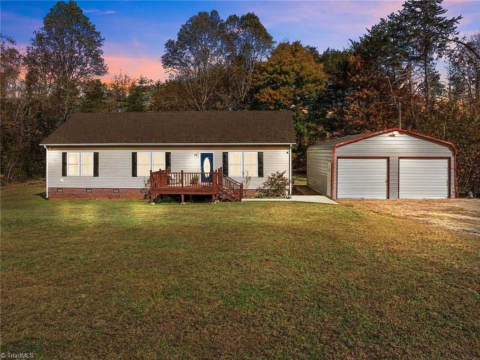 Tucked on a level 1.3 acre lot framed by mature hardwoods, this inviting 1-story 3 bed 2 bath home blends comfort, privacy, & convenience. Inside, a bright, split floor plan centers around open kitchen and living areas. The living room’s fireplace anchors the gathering space, while the kitchen impresses w/ stainless steel appliances, glass lighted showcase cabinets, abundant counter and cabinet space, and laminate flooring. An adjacent laundry room adds convenience to the backyard. Primary bathroom = dual vanities and both a walk in shower + separate garden tub. A standout feature: the metal two-bay garage is wired, heated w/ a woodstove, and outfitted w/ a built-in workbench and mounted speakers. 2022 HVAC. NO HOA! Park your RV, boat or trailer! Located right on the Burlington-Alamance/Caswell line, this property offers the added benefit of access to a charter school and a lottery school option. Short distance to Lake Cammack & Ace Speedway. Quick access to Highways 49/62/87/119.