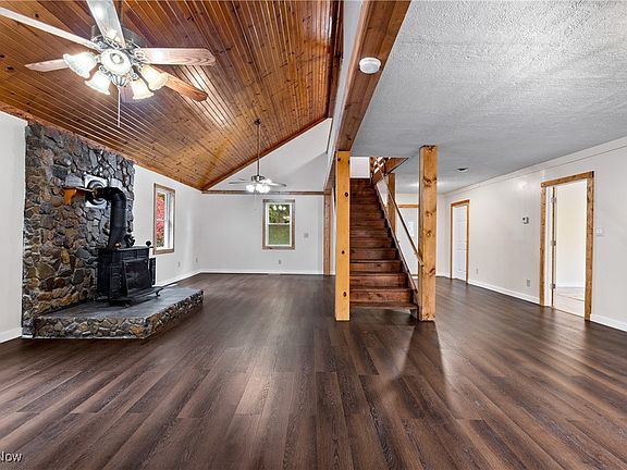 The property includes a one-car garage and ample parking spaces. It also boasts a double deck with stunning views and a dedicated pet bath. Set on over half an acre, the yard features a fire pit and a picturesque running stream, adding to the home's charm.