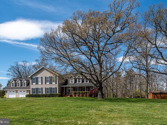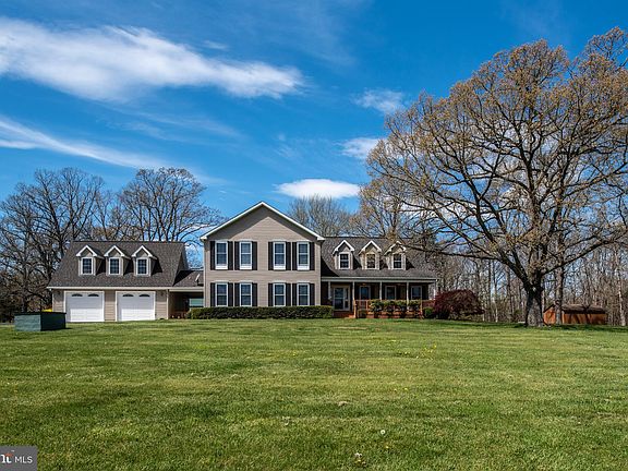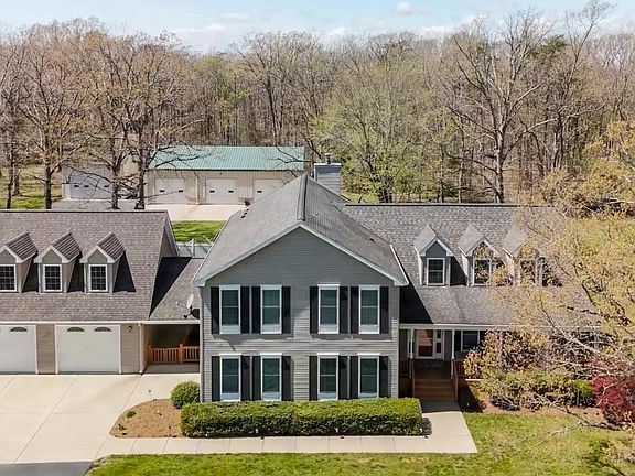 Beautiful colonial with country porch on 14.4 acres, nicely landscaped. Owner financing available with negotiable terms. Updated kitchen and bathroom. Freshly painted interior and pressure washed on exterior. Gleaming hardwood floors throughout. The den and office on main level can be 5th and 6th bedrooms because they do have closets. All bedrooms are huge and have ceiling fans. Master bath recently remodeled has large fancy multi-spray shower. Family room has electric fireplace that can be converted back to gas and built-in shelving. Over 9+ feet ceiling in unfinished basement with walk up stairway to breezeway. Heat pumps are one and three years old. Unfinished bonus room on upper level has a lot of potential uses fully insulated and electrical outlets installed. Alarm system installed. Breezeway off laundry room leads to oversized 2 car garage that has large unfinished space with staircase. Sprinkler system in front & backyard. Great setup for automotive enthusiasts and hobbyists with the other two large garages and enormous paved parking area. Commercially built detached 6 car space garage with bathroom, gas heater and high ceiling. Car lift, metal shelving and air compressor does not convey but is negotiable for sale. One garage is 24x44 the other garage is 40x60. Within the 14+ acres are two ponds, the large one is stocked with fish and has a peaceful setting.