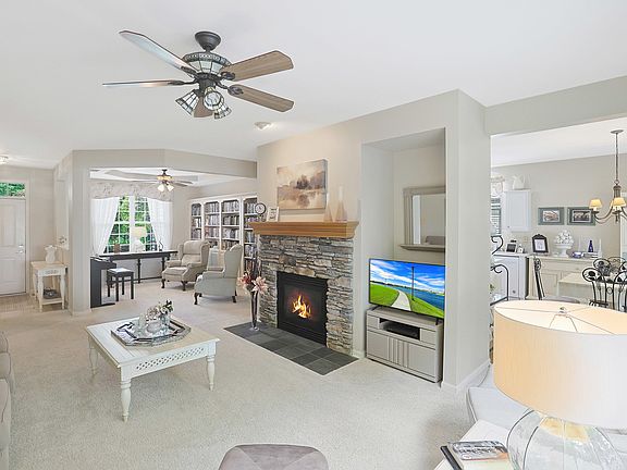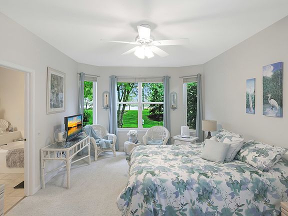 IF A VIEW IS IMPORTANT THIS IS A MUST SEE!! SUNSETS ARE INCREDIBLE ~ BACKS TO WILD FLOWER LAKE~ THE MACKINAC MODEL, A DEL WEBB ORIGINAL ~ APPROX 1750 SQ FT ~ NO HOMES BEHIND ~ GREAT CURB APPEAL ~ CLOSE TO LAKE, GOLF COURSE, CLUB HOUSE AND MORE! LEAD GLASS FRONT DOOR ~ TWO BEDROOMS ~ TWO BATHS ~ LOVELY BUILT-IN CABINETS AND TRAY CEILING IN DINING ROOM/LIBRARY ~ COZY GAS FIREPLACE IN GREAT ROOM ~ HARDWOOD FLOORS IN EATING AREA ~ PULL DOWN STAIRS TO FINISHED ATTIC, ABOVE GARAGE~BAY WINDOW IN PRIMARY SUITE ~ TWO SINKS IN PRIMARY BATH ~ OVERSIZE CLOSET IN PRIMARY ~ CEILING FANS ~ BRICK PAVER PATIO AND DECK ~ GARAGE ENERGY PACKAGE ~ LAUNDRY SINK ~ MATURE LANDSCAPING ~ MOVE-IN READY ~ DON'T LET THIS ONE GET AWAY!!