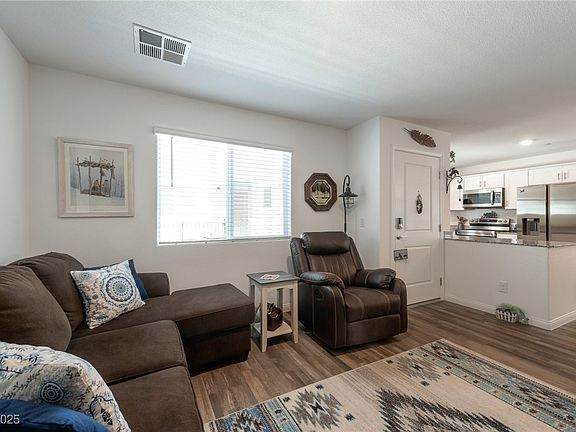 Please come take a look at this pristine home w/the most desired floor plan in the community. The last 2 model match listings sold in 1 day and 19 days respectively. This inviting end unit home features an open floor plan w/ plenty of natural light permeating from the addition of 2 extra windows in the dining room and garage entry room. The kitchen features white shaker cabinets, stainless-steel appliances, granite countertops. Dining area has dedicated lighting. First floor features luxury vinyl flooring, 4-inch baseboards. The second floor includes 3 large bedrooms, all w/well-padded carpet. Large separate laundry room with shelving centered on the second floor and near bedrooms. The spacious primary suite offers a private bathroom w/ a large walk-in closet. Fenced and gated courtyard at entry. This really is a wonderful layout. This quiet community is nicely situated near I-15 and the Las Vegas strip w/ easy access for commuting to work or California. Cox cable included in HOA fee!