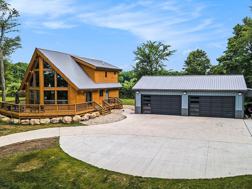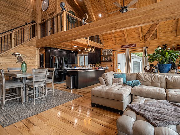Crafted with Hemlock and Cedar, this beautifully built log cabin offers 4 bedrooms, 3 full bathrooms and a spacious open floor plan with stunning views of Sherman Lake. Located on a peaceful 1.5 acre lot the home combines rustic charm with modern finishes and thoughtful upgrades throughout. Designed for both comfort and functionality, the home features two full kitchens will quartz counter tops. One on the main level and another in the fully finished basement ideal for guests or extended family. The impressive 32x40 pole barn with a 28x15 lean-to are both outfitted with high-efficiency LED lighting. The partially heated driveway adds year-round convenience, making winter maintenance and accessibility easier during colder months.