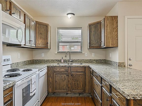 Attention Investors! This fully leased and totally renovated 3/2 duplex is just steps away from the TAMU bus stop and will not last long! Fully renovated in 2019 with lovely cabinetry, Santa Cecilia granite counters in kitchen and baths, deep kitchen sink, Barn doors on 2 bedroom closets, vinyl plank floors throughout, tilt in vinyl windows, ceiling fans in most rooms, Upgrades include recently replaced cabinets in kitchen and vanities, & resurfaced bathtubs. 2 yr old HVAC including new ductwork and foam insulation. Roof in 2018. Fabulous covered deck with private back yard. No back door neighbors! Leased through July 2024 with beautiful rents! A definite must see! Washer and dryer & fridge may convey with accepted offer.