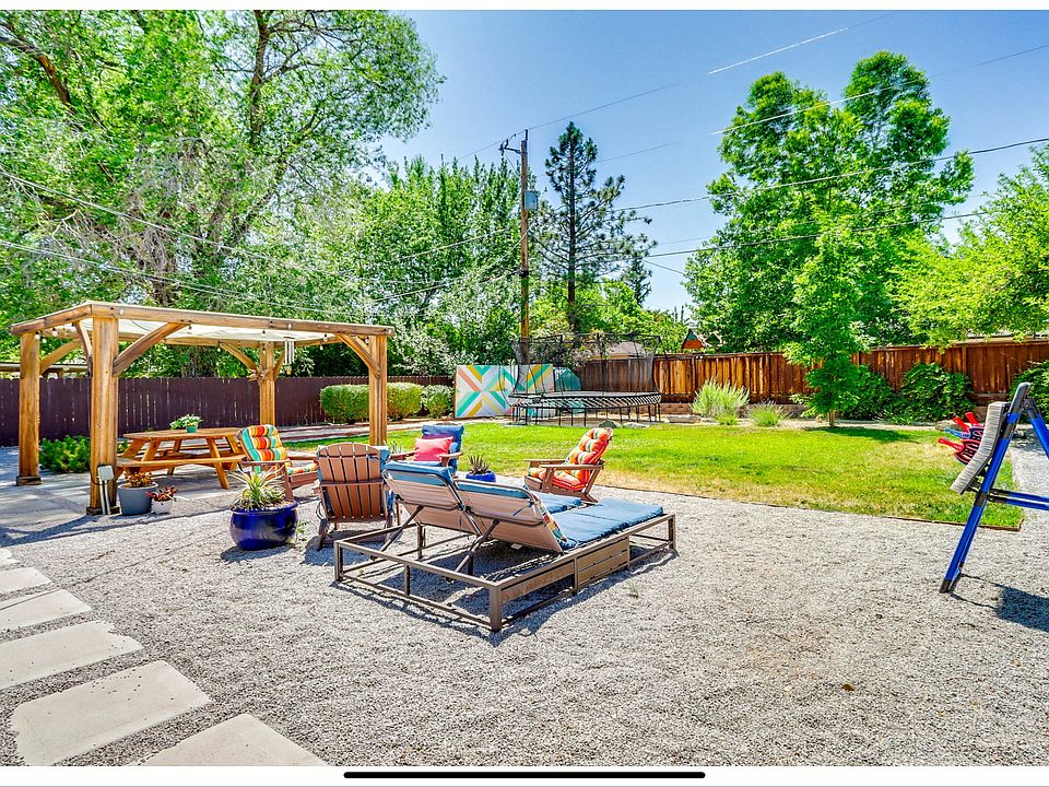 3 BR BA, fully furnished, bungalow midtown/old SW home with recently renovated large finished basement (not counted in sq footage) in Reno's most family friendly neighborhood! Home is on a very quiet street with no through traffic and all owner occupied homes. Home has well tended, sunny back yard with gardens, pagoda, fire pit, water feature, trampoline and bocce court. This is a dream location for families - walk to Jesse Beck Elementary School, easy cruiser bike ride to Truckee River and midtown restaurants. 4 miles from Reno airport. 24 miles to Mt Rose skiing. Home is nearly 100 years old and retains its charm! Neighborhood is full of families who have been in their homes for decades, yet are very welcoming to newcomers. Large driveway for multiple vehicles, RVs, etc. 1 car garage that can hold 1 small vehicle or all of your gear.