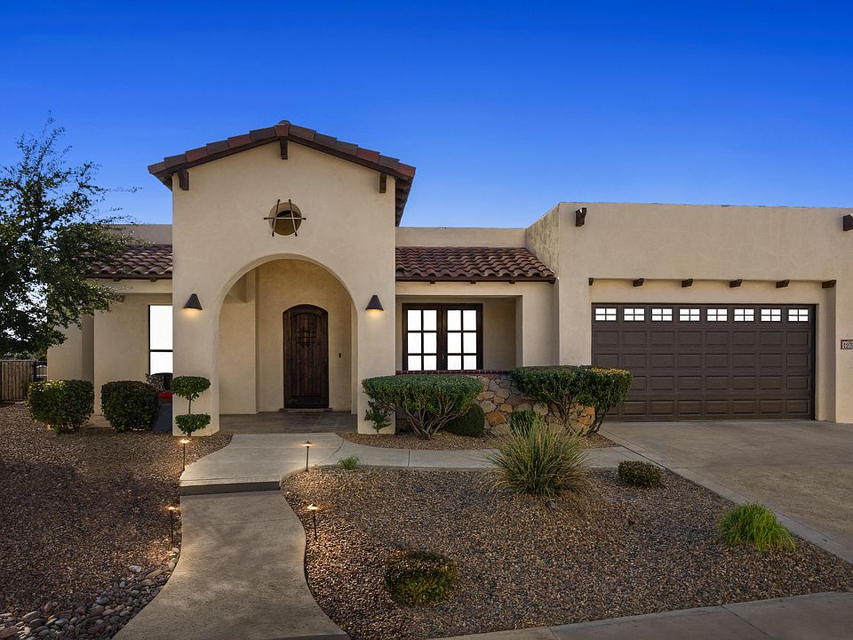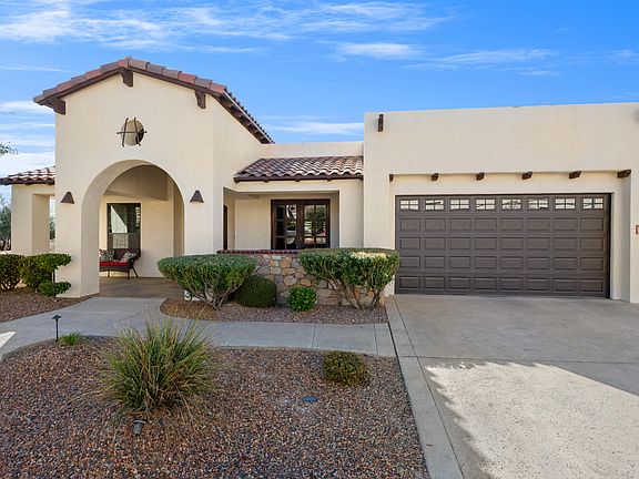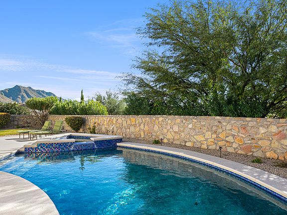 Warmth and character abound in this beautiful Tuscan style home. With views of the Franklin Mountain, it is located on a corner cut de sac lot. A covered porch extends across the front of the home where you can sit and enjoy expansive views. A kiva style fireplace is a striking visual and enjoyed from the live-in room, kitchen and dining room. Rich, dark woods in the shutters and floors add ambiance and fabulous upgrades in the kitchen make it an enjoyable work area. The backyard is a special oasis with a heated pool and spa set among beautiful landscaping and more mountain views. A stunning MUST SEE!