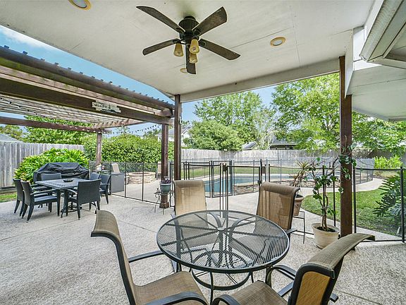 This stunning 4 bedroom home is ideal for hosting gatherings with loved ones both indoors and outdoors. Recently replaced fence and roof is less than 2 years old. The property features a private pool with a heated spa and lights, fire pit, and spacious covered patio for outdoor entertainment. Just off the patio you have access to an Outdoor pool bath. Inside, you'll find an upgraded master bathroom and closet, a large island kitchen with ample storage and counter space, and 18-inch ceramic tile throughout. The garage boasts a protective epoxy coating. This home is flood-free and ready for you to move in and enjoy. Don't miss the opportunity to schedule a showing and see all the wonderful features this property has to offer!