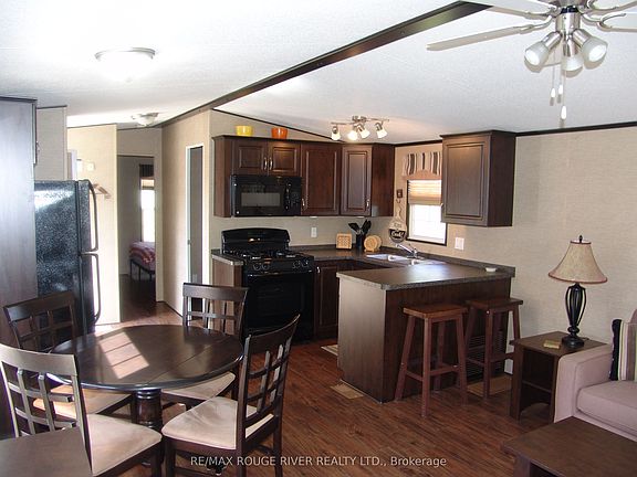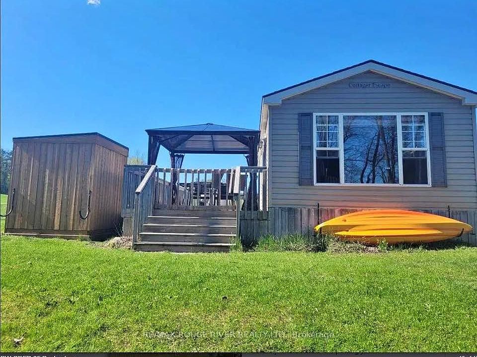 Experience pure relaxation at Bellmere Winds Golf Resort, stretching from the north shore of Rice Lake to the furthest sand bunker and just minutes from the vibrant city of Peterborough. This resort offers the perfect escape located in Phase One, 25 Godfrey's Lane is a tree-lined, sought-after waterfront premium site backing onto the peaceful 11th, 12th & 13th greens. Offering a spacious living/family room, full eat-in kitchen with breakfast bar, primary bedroom with queen bed & walk-in closet, second bedroom features bunkbeds with 1 double & 1 single, 1 pull-out couch sleeps two, 4 pc. bath and walkout to a large pressure-treated deck with hard top gazebo! The cottage provides a private, scenic, luxurious escape with direct access to Rice Lake. Just steps from the beach, docks, water sports, gym and sports courts, blending tranquil waterfront living with unbeatable proximity to amenities. It's a perfect destination for both golf lovers and families; you're never too young to enjoy the great outdoors! Offering several fantastic family-friendly activities, including 2 saltwater swimming pools, a splash pad, a beach, exciting resort activities and unmatched firework displays. Featuring 18 challenging yet approachable holes, this course caters to all skill levels, with tee blocks set for both novices and scratch golfers. The front nine evokes the feel of a Scottish links course, with breathtaking vistas of Rice Lake reminiscent of the Bonnie Banks of Loch Lomond. The back nine is more forgiving, highlighted by a stunning elevated 10th hole, while the 11th and 12th play along the lakeside resort with stunning lake views!