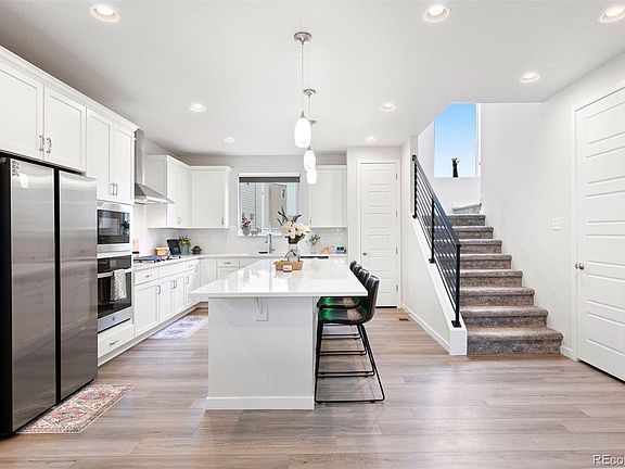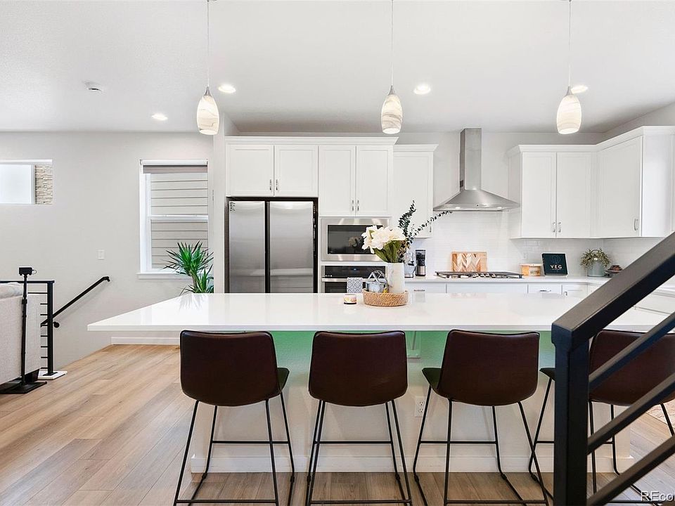 Step inside and you’ll find a smart, airy layout. The entry level offers a 2-car garage, a private office with sleek laminate floors, and a generous storage closet. Upstairs, the main level impresses with an open floorplan, striking cast-iron railings, and continuous laminate flooring. At the heart of the home, the gourmet kitchen shines with crisp white cabinetry, quartz countertops, stainless steel appliances, and an oversized island that easily seats six—perfect for casual meals or lively entertaining. Just off the kitchen, a private balcony invites you to take in peaceful open-space views, while another roomy storage area keeps life organized.